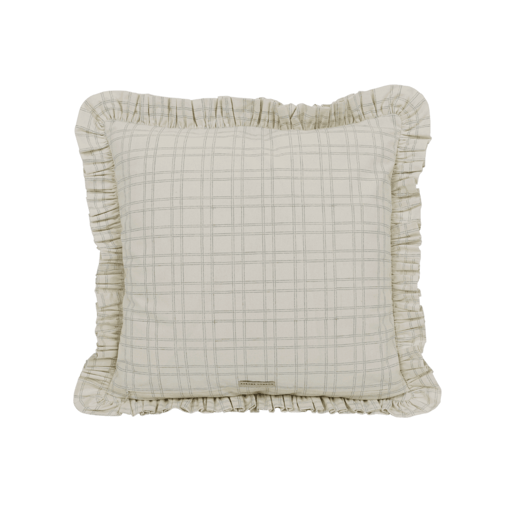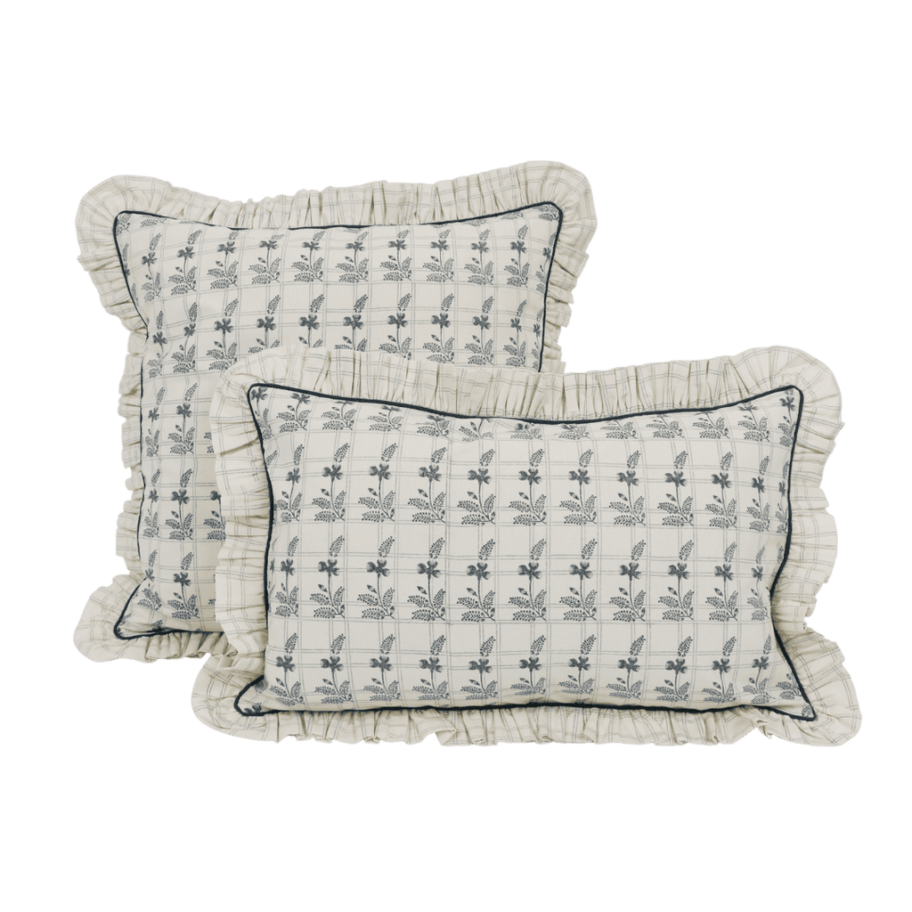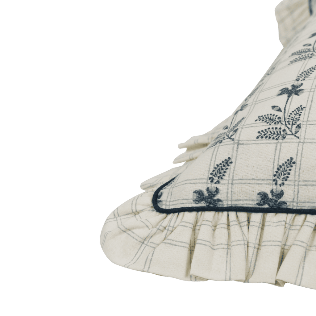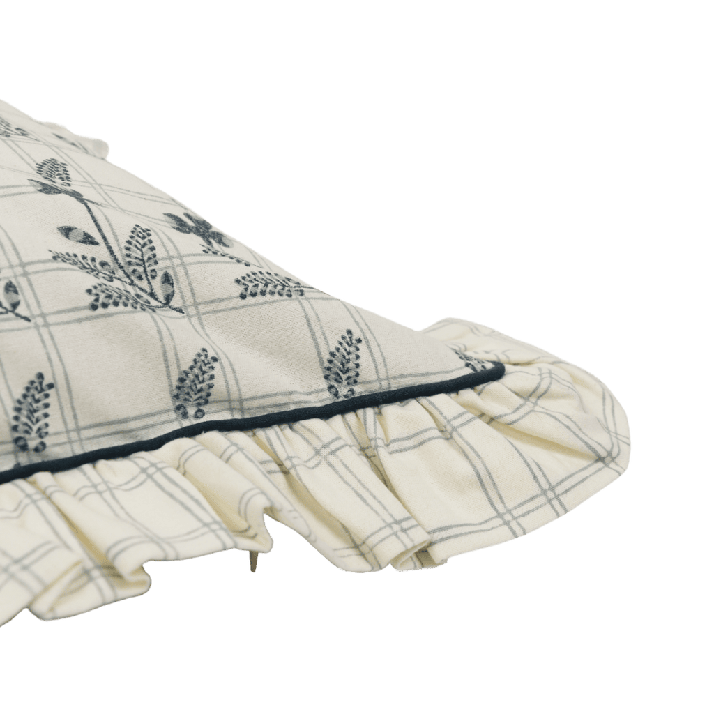 This cushion, exclusive to Aurane London, is inspired by British 18th Century Delft designs. Crafted from 100% cotton, this versatile wooden block, layers check and floral designs, accented with a ruffle edge and cotton inset piping.