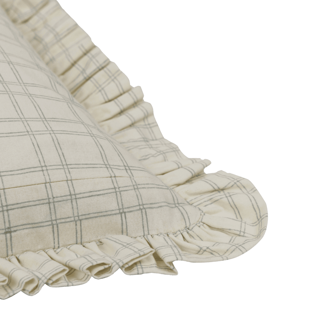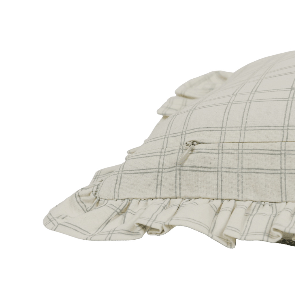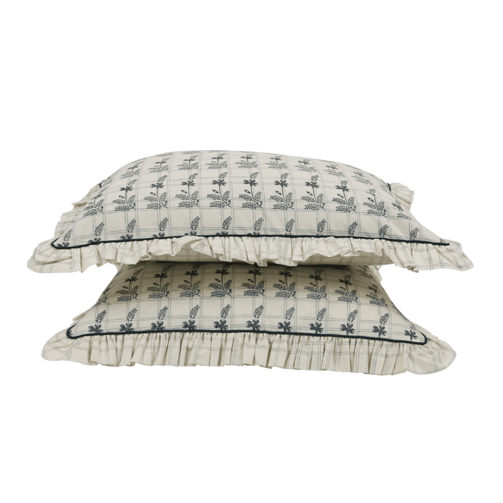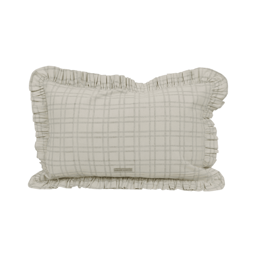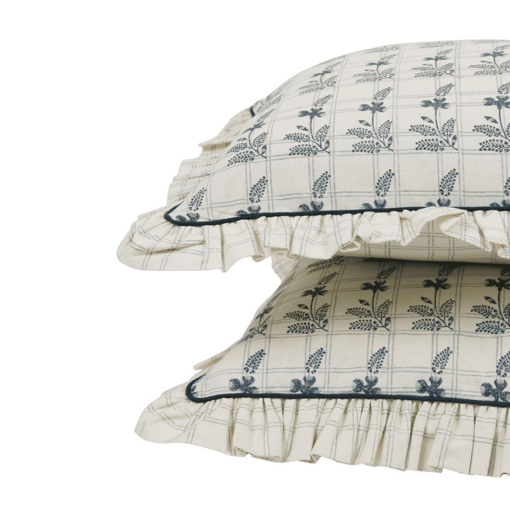 This cushion, exclusive to Aurane London, is inspired by British 18th Century Delft designs. Crafted from 100% cotton, this versatile wooden block, layers check and floral designs, accented with a ruffle edge and cotton inset piping.