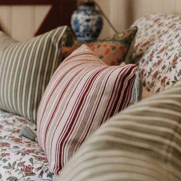 This cushion, exclusive to Aurane London, woven by master weavers in Jaipur, India. Every cushion is unique handwoven textile, with its slubs and textures, a testimony to hours of patience of this handcrafting process.