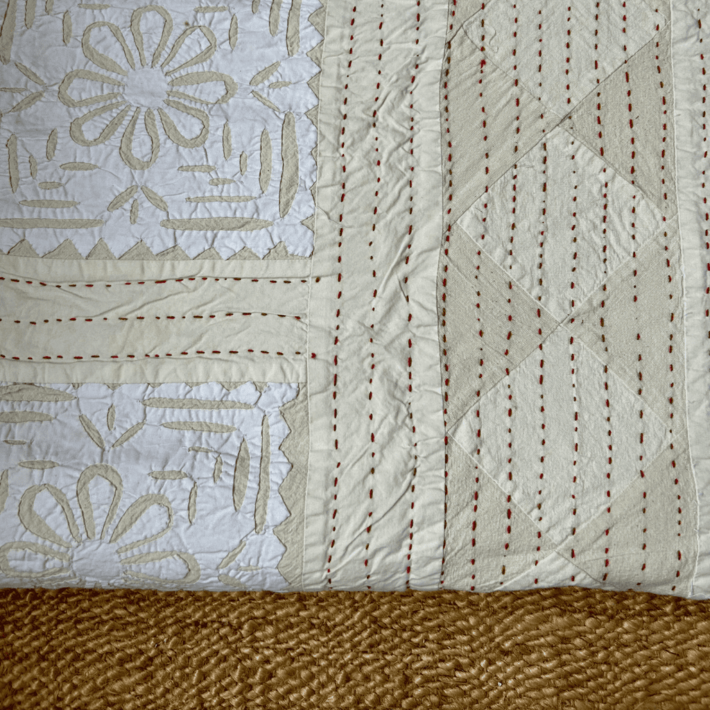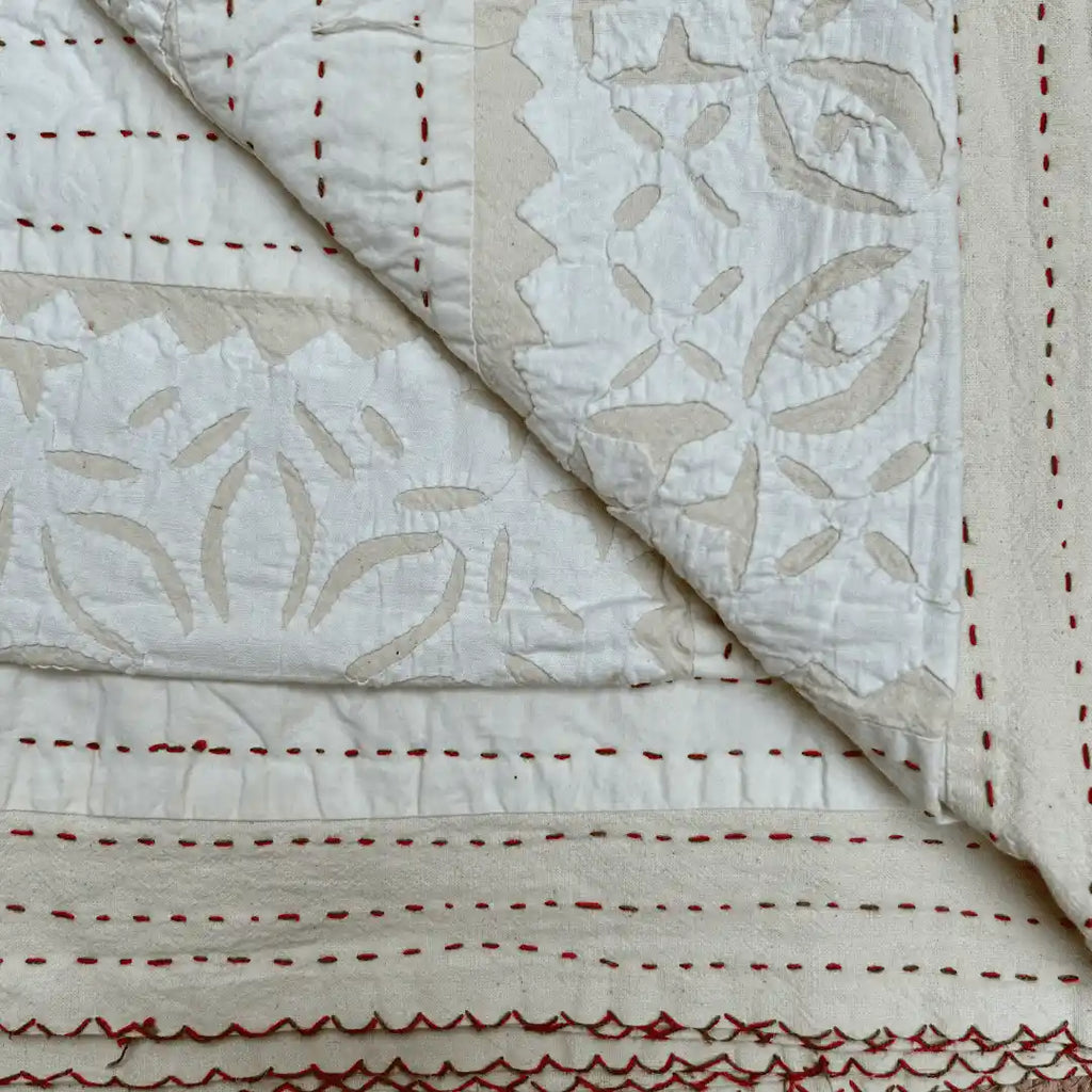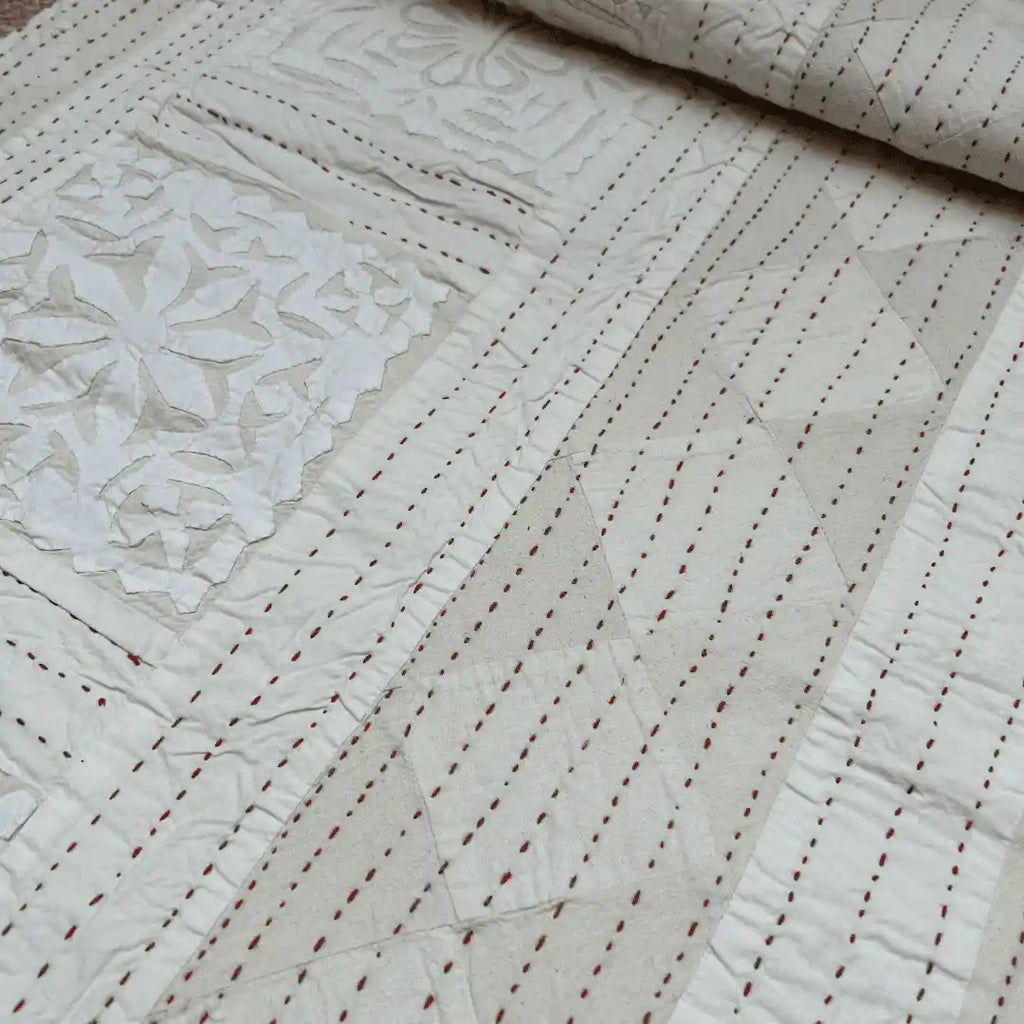 to reveal each unique design of the cut work. Each bedspread is then overlayed hand applique stitched.
