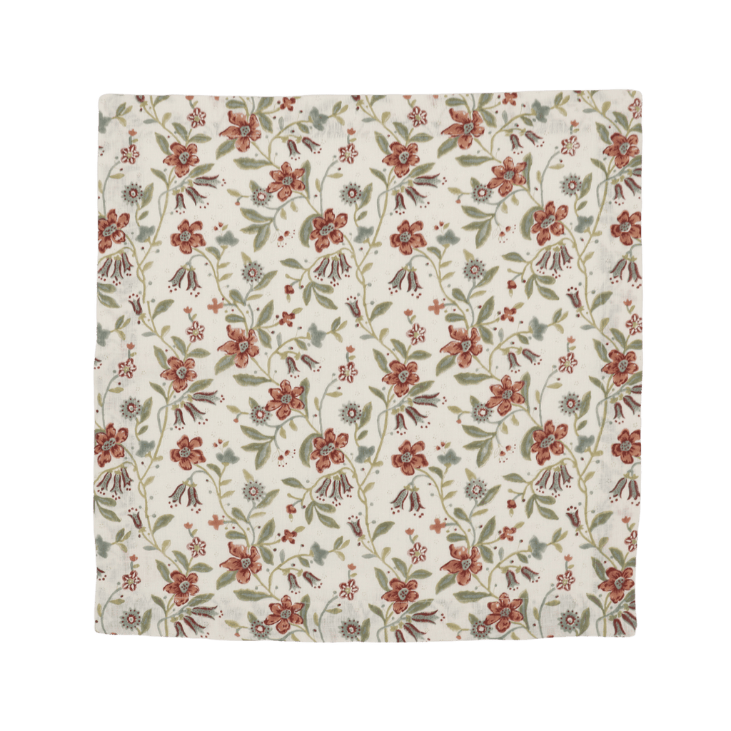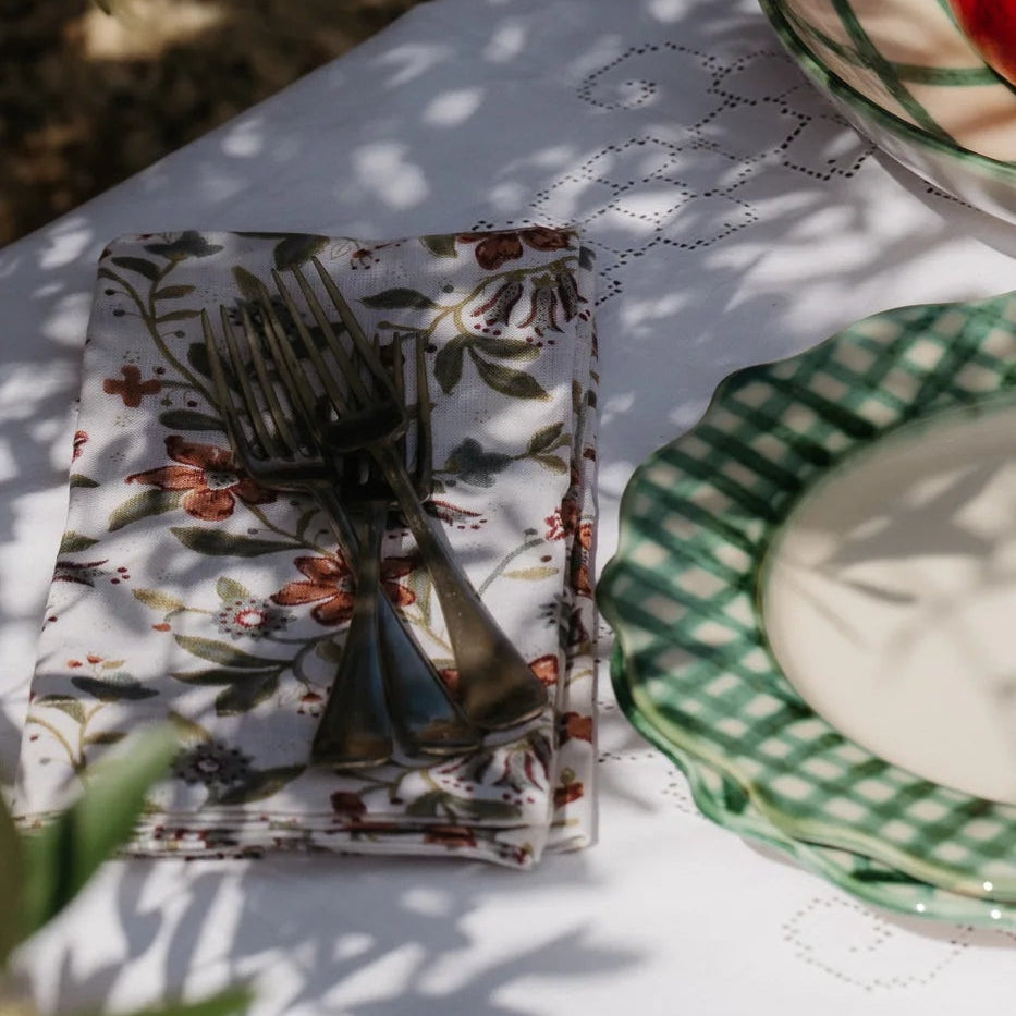 A set of four hand block printed 100% European linen napkins, inspired by 19th Century floral chintz patterns. Detailed with a mitred border.