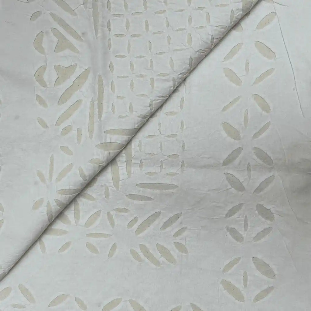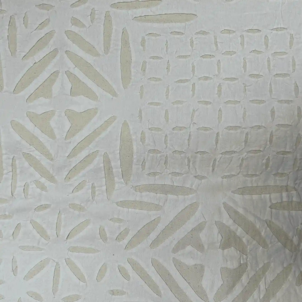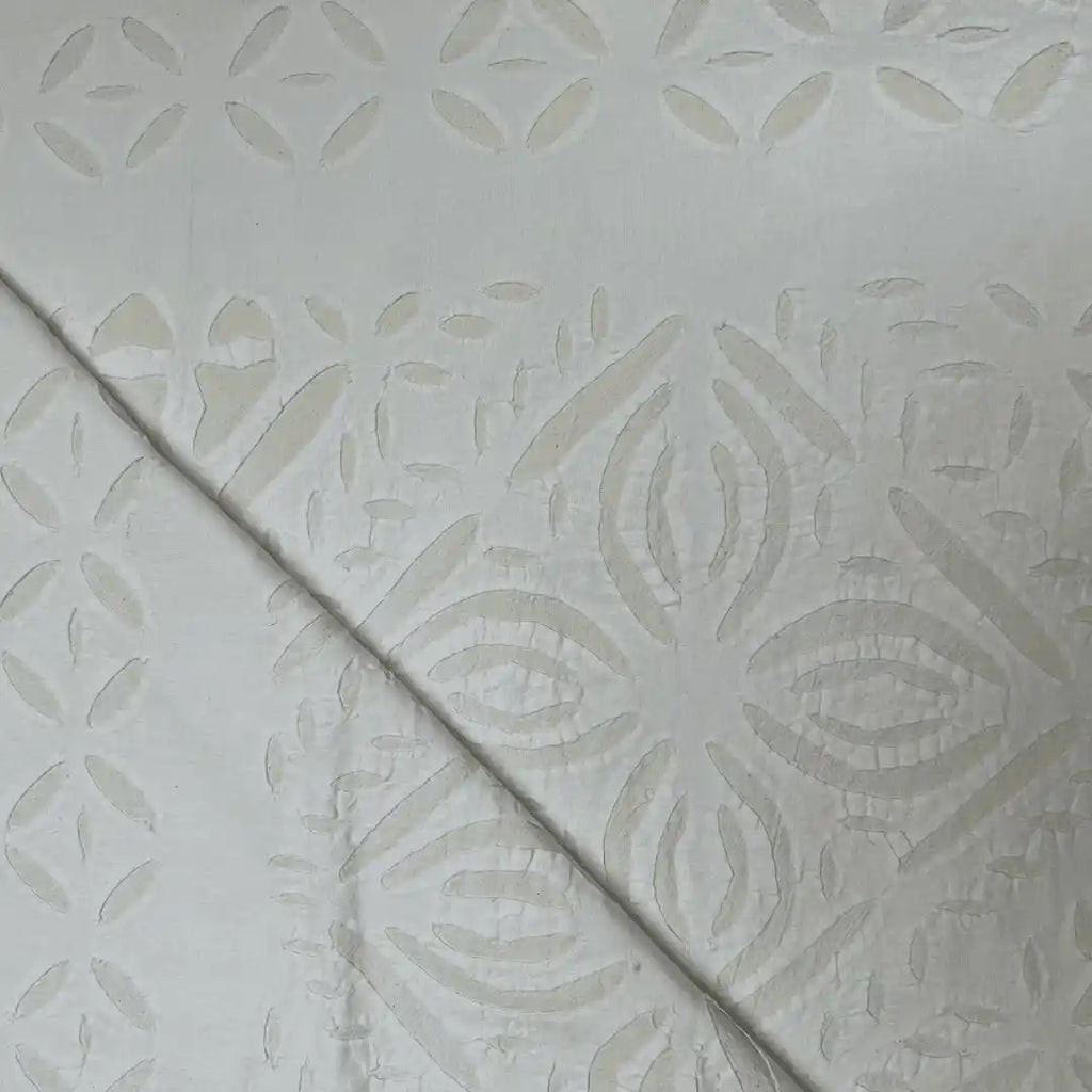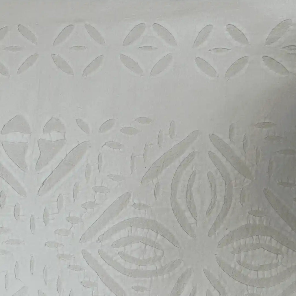 Beautiful Indian cut-work bedspreads. The face cut in papery ivory cotton fabric and backed with a lightly contrasting cream cotton, hand stitched together